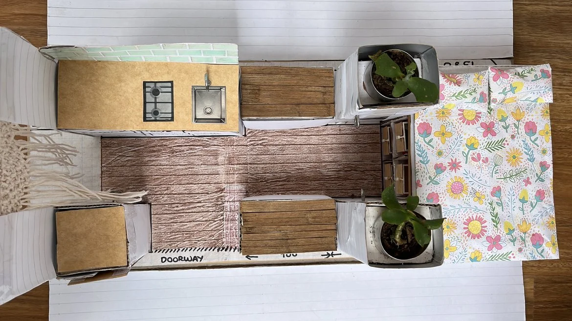 That Summer I decked it out loosely with a bed, a couple of IKEA units, an esky, some wire baskets and an Anaconda camp kitchen! This gave me the chance to experience the space and note what was important. From there, I built a 3D, to scale, cardboard model (much to Jesse and Sam’s amusement I think!) This allowed me to see if the design I had come up with would actually fit the space (Mercedes Sprinter LWB) and gave me something tangible to hand to the BFA team to fine tune before the build.